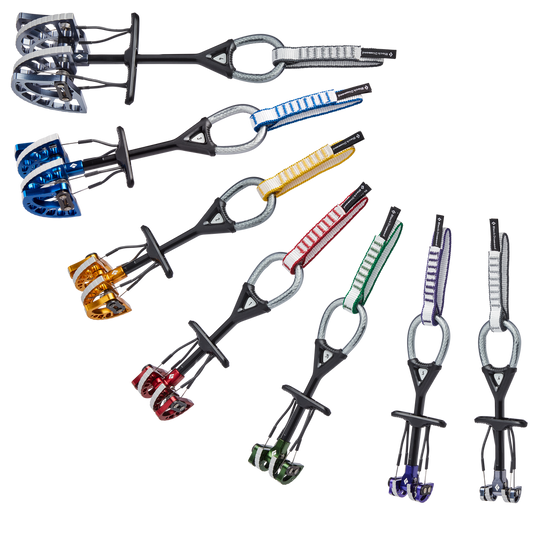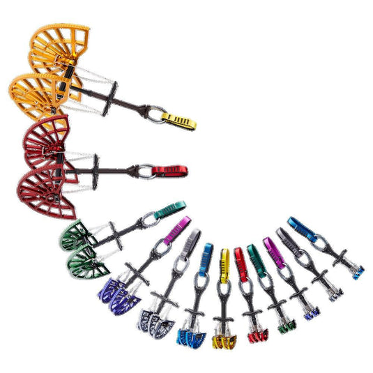 I ganci a camma sono usati per avanzare rapidamente e senza problemi su fessure. L'uso della leva applicata trasferisce il peso corporeo in forza di tenuta contro la roccia. Posiziona i pezzi di pr...