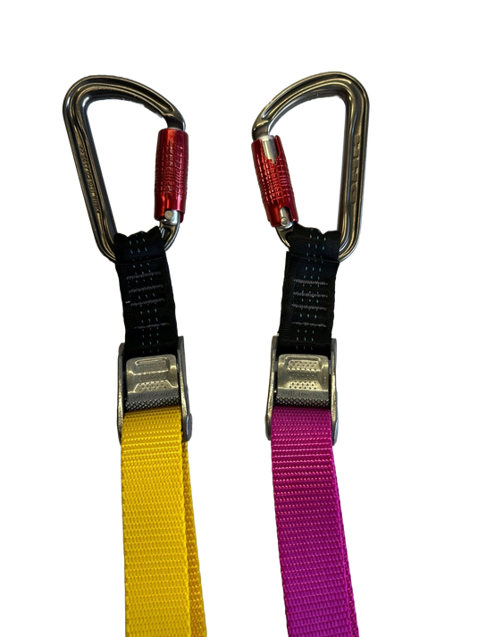 La fibbia ha SOLO un carico di lavoro di 350 libbre secondo il produttore. Questa margherita regolabile è dotata di una fibbia a camma con rullo. La fettuccia scorre in modo super liscio sia che tu stia tirando allentata o rilasciando la fibbia. Queste fibbie possono essere sganciate quando sono sotto tensione. Dispone anche di una fettuccia tubolare Bluewater da 1" per il punto di connessione del moschettone. *Gli armadietti DMM nella foto NON sono INCLUSI